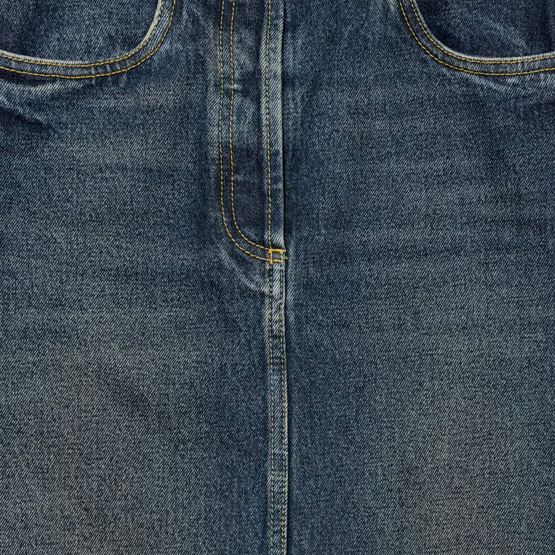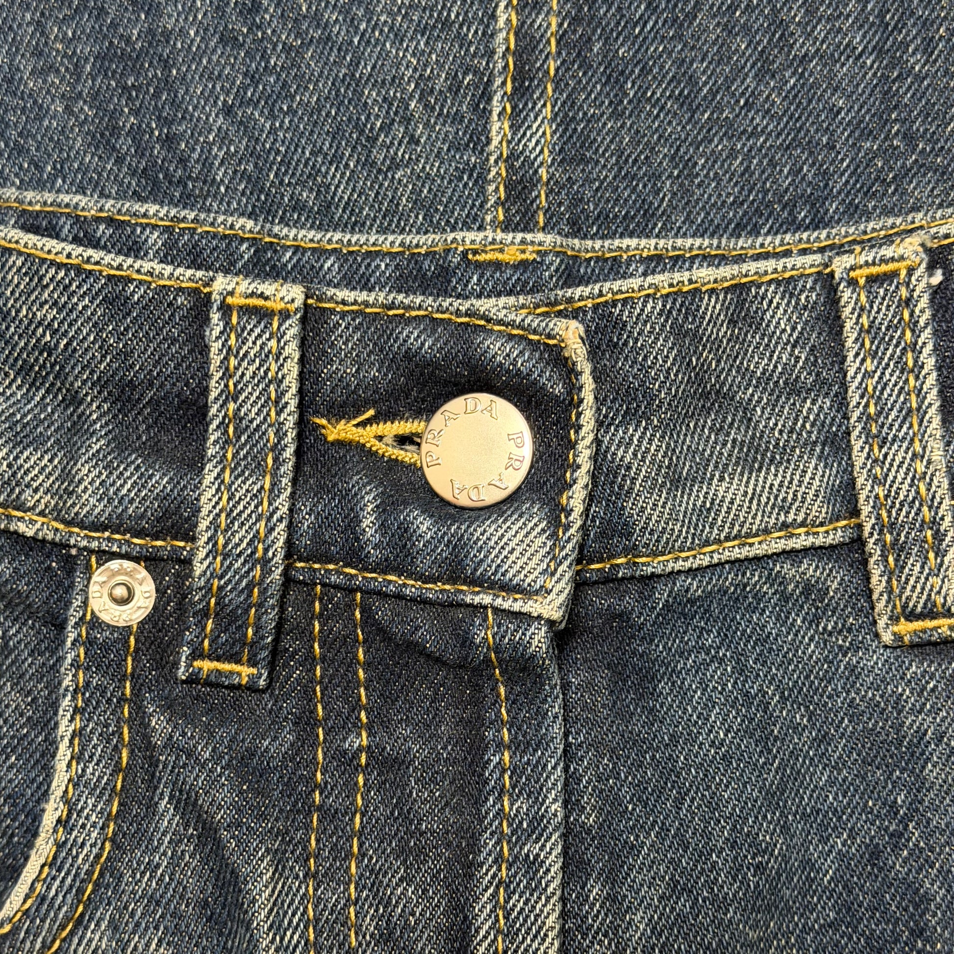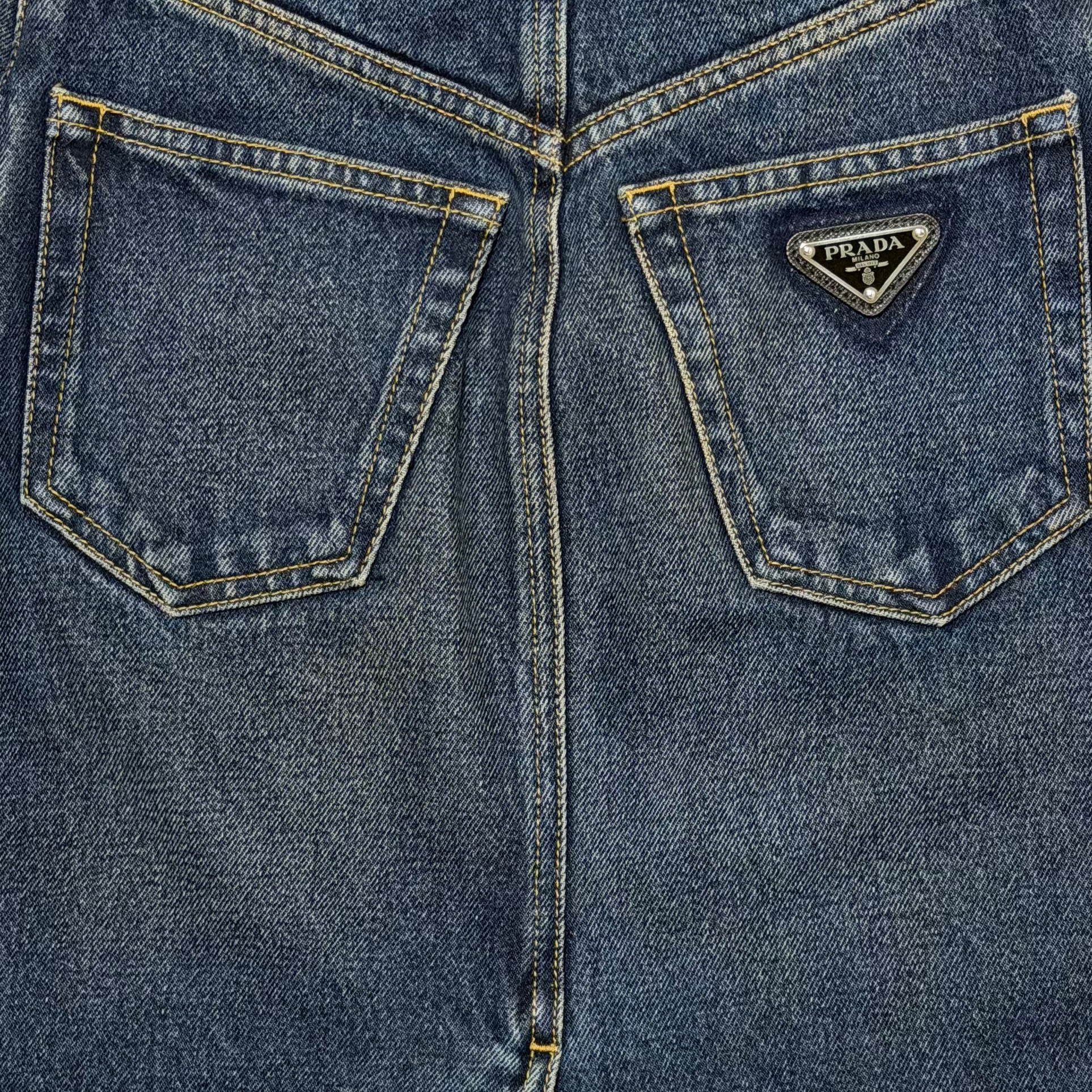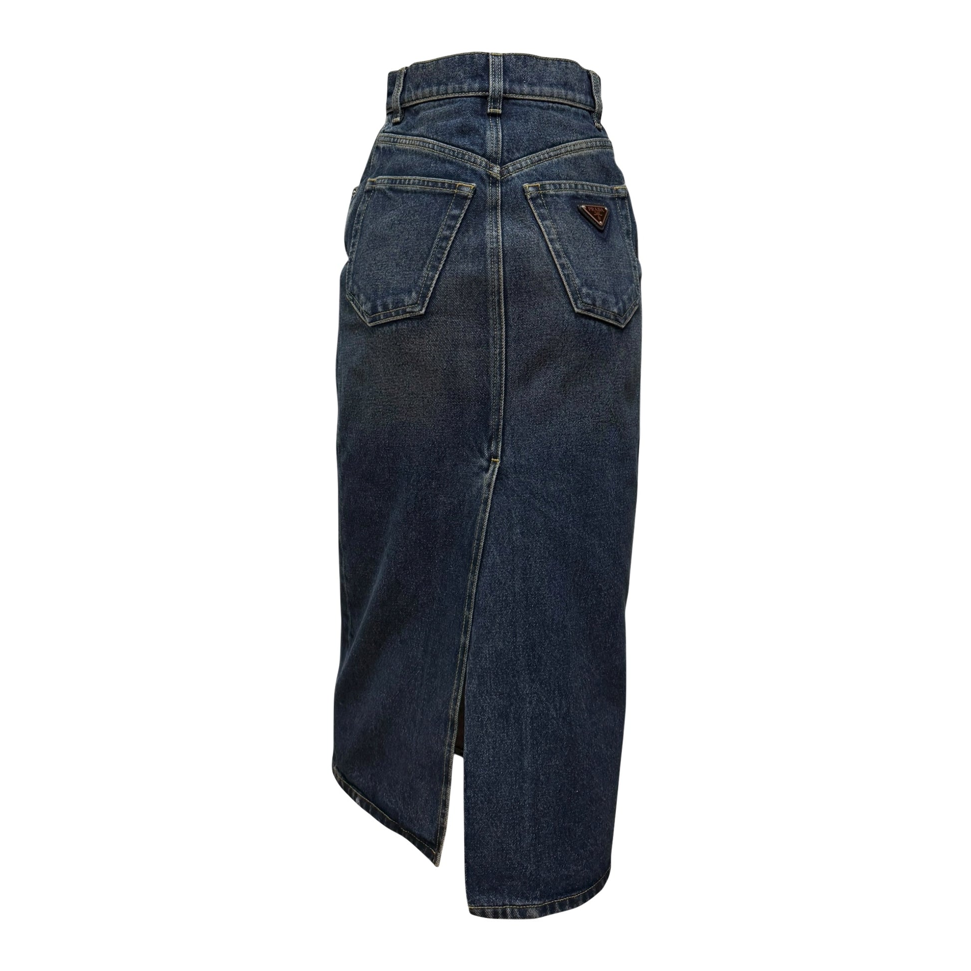 PRADA High-Waisted Denim Midi Skirt with Back Logo Plaque